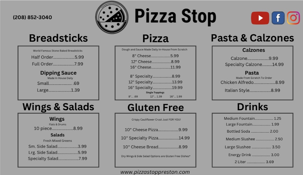 Introducing the menu at Pizza Stop Smithfield, a culinary gem located at 25 W 100 N in Smithfield, Utah. This pizza haven has quickly become a local favorite, delighting customers with its mouthwatering variety of pizzas. From the beloved meat lovers to the standout chicken bacon ranch, each slice boasts a perfect balance of flavors and a delectably crispy crust. Reviewers rave about the cheesy breadsticks, served with a rich marinara for dipping, which have garnered enthusiastic praise for their unique crunch and flavor. The BBQ Chicken Pizza and the intriguing jalapeño ranch are also must-tries, enhancing the menu's reputation for creativity and quality. Friendly service ensures a welcoming experience, making each visit memorable. Whether you're craving a classic or something fresh and exciting, Pizza Stop Smithfield promises gourmet flavors that will leave you returning for more.